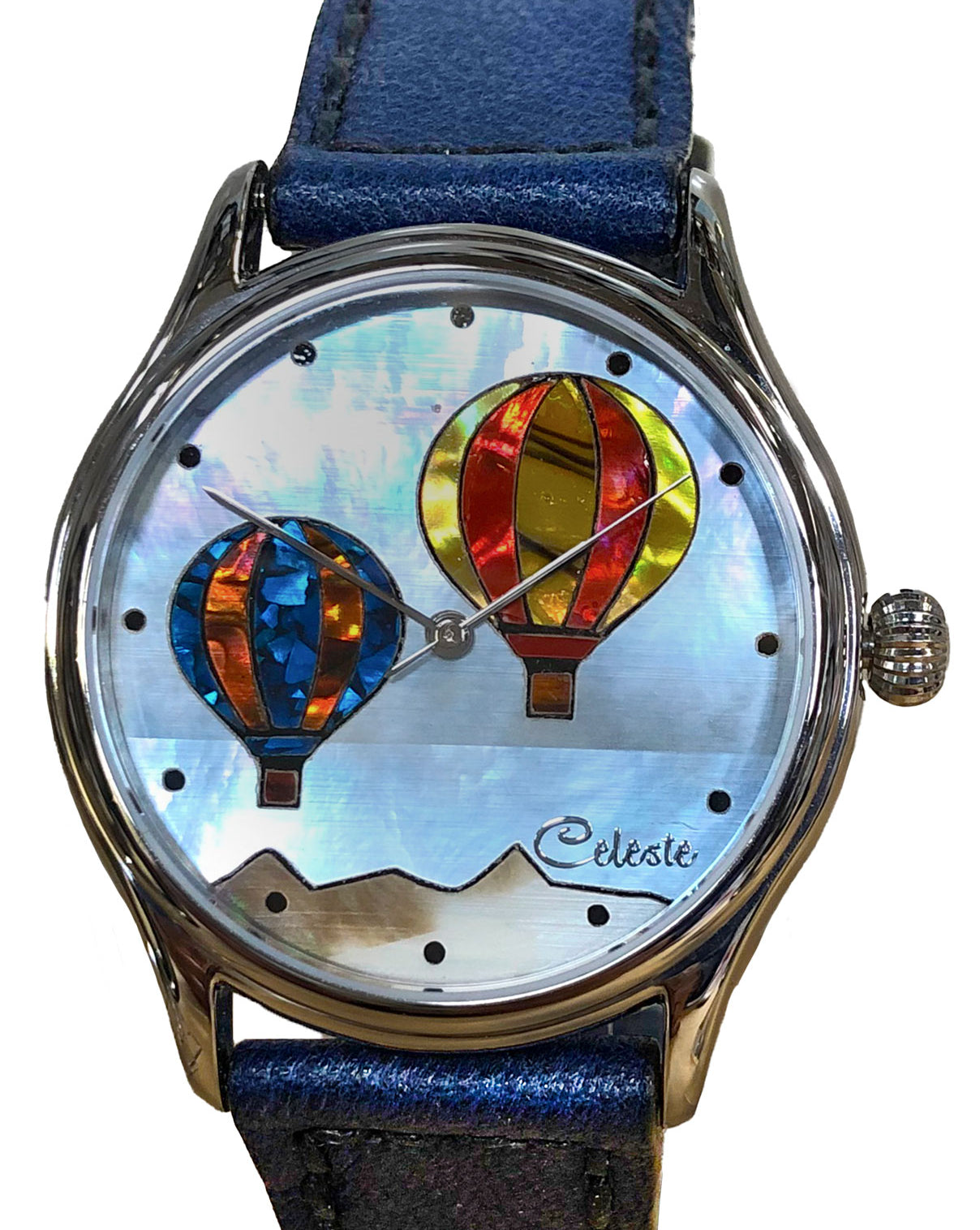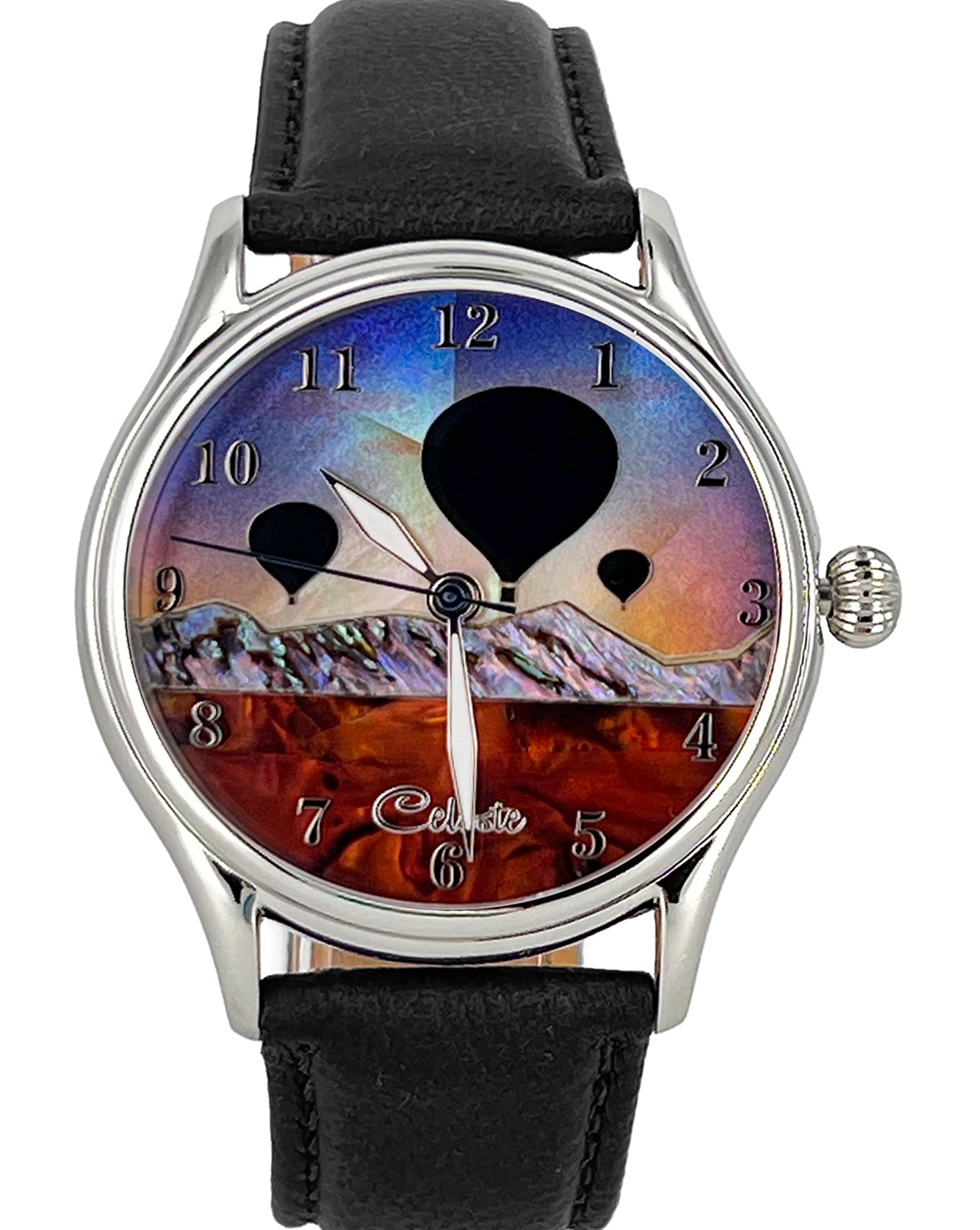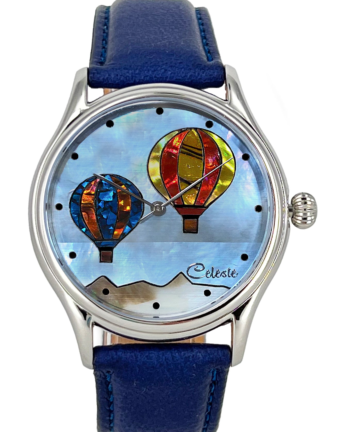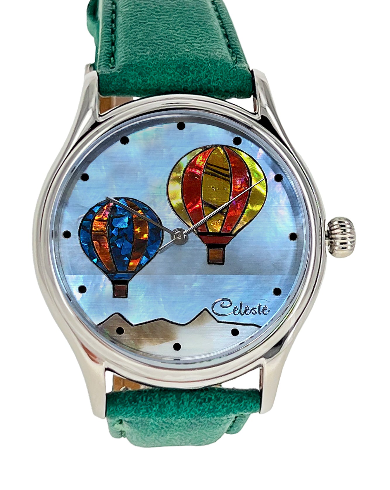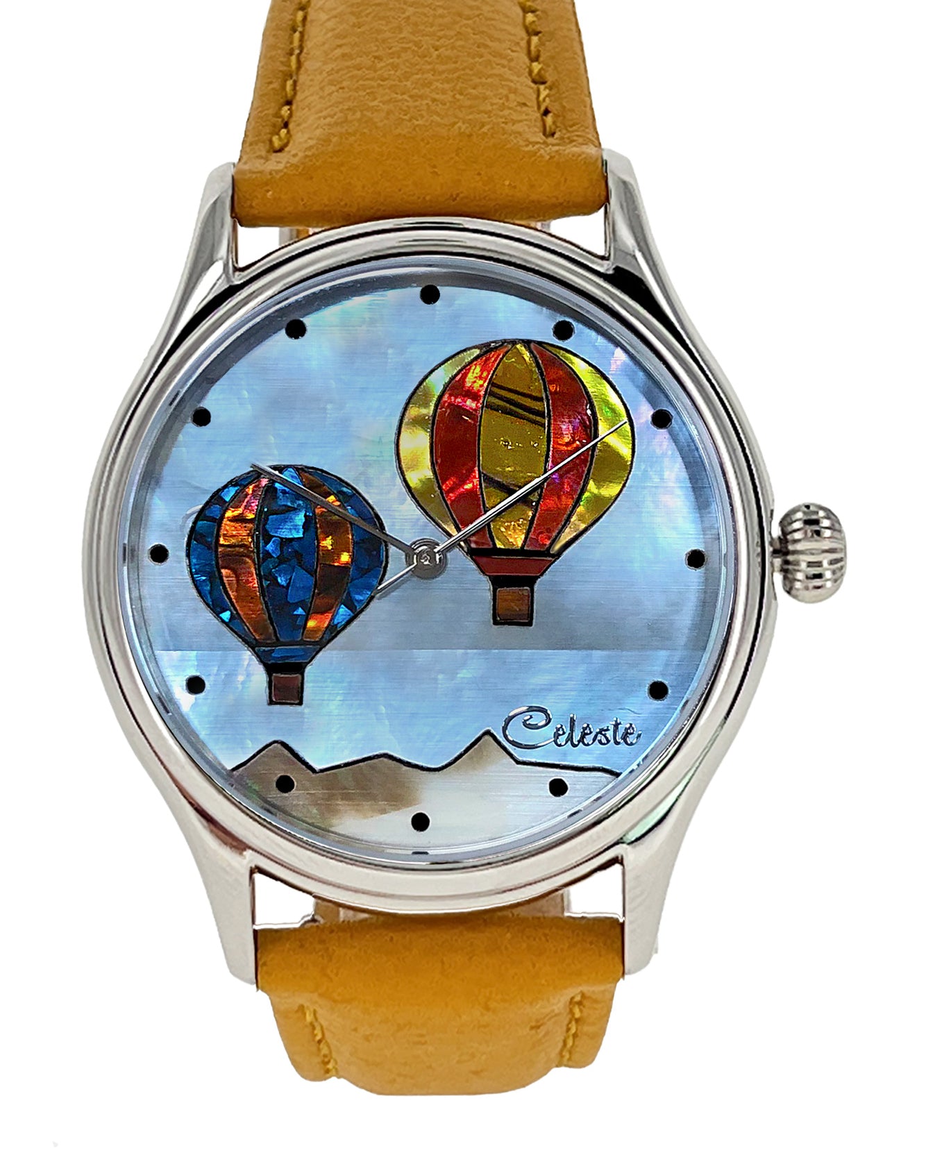 This collection explores color, height, and atmosphere through hand-inlaid shell and reflective depth. As light moves across the dial, the surface shifts like sky at different hours of the day.