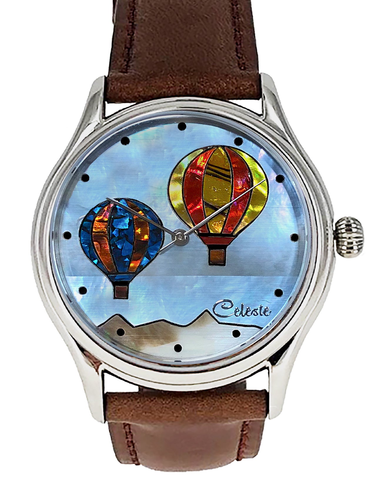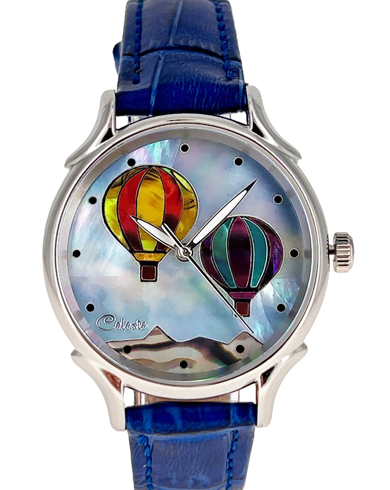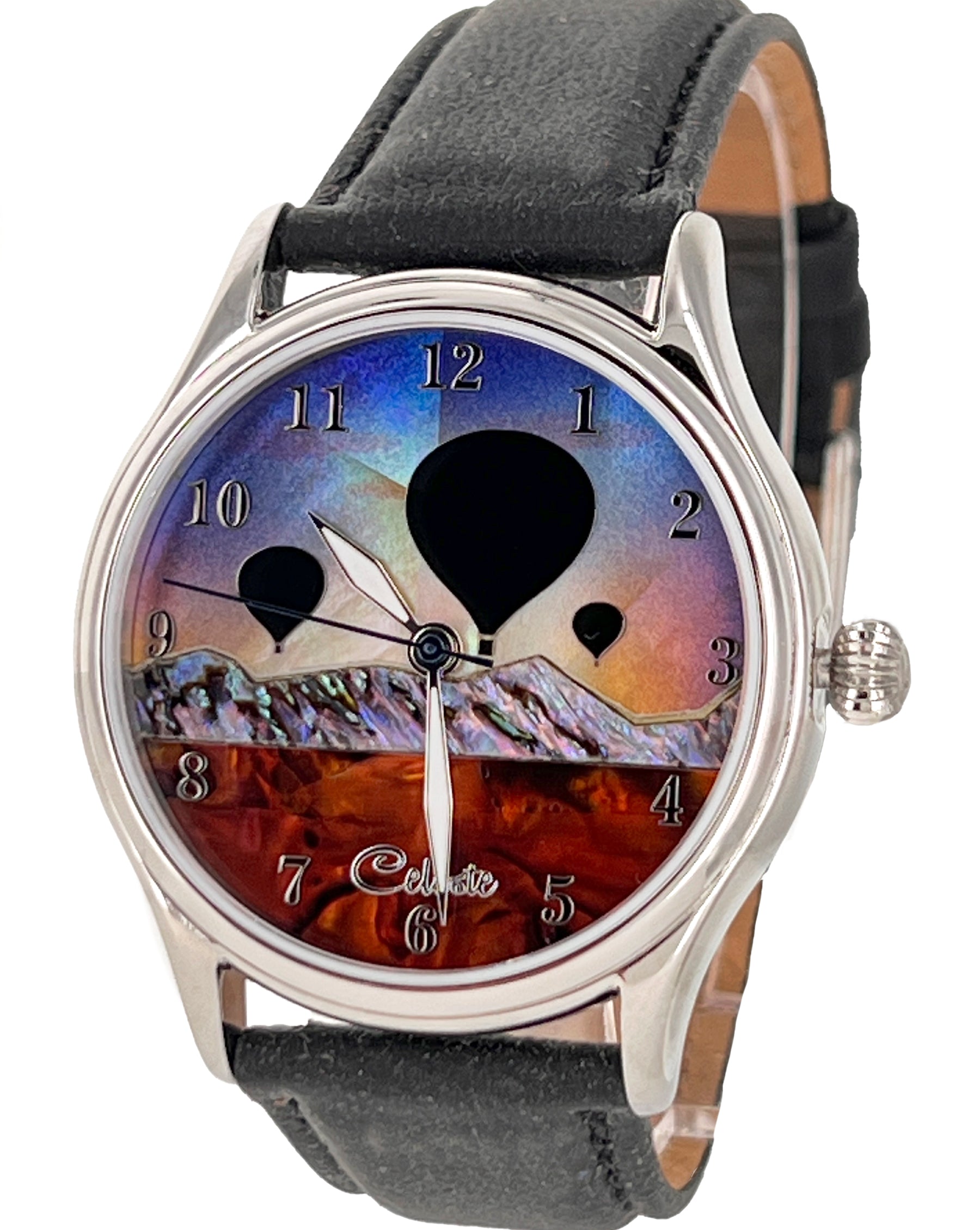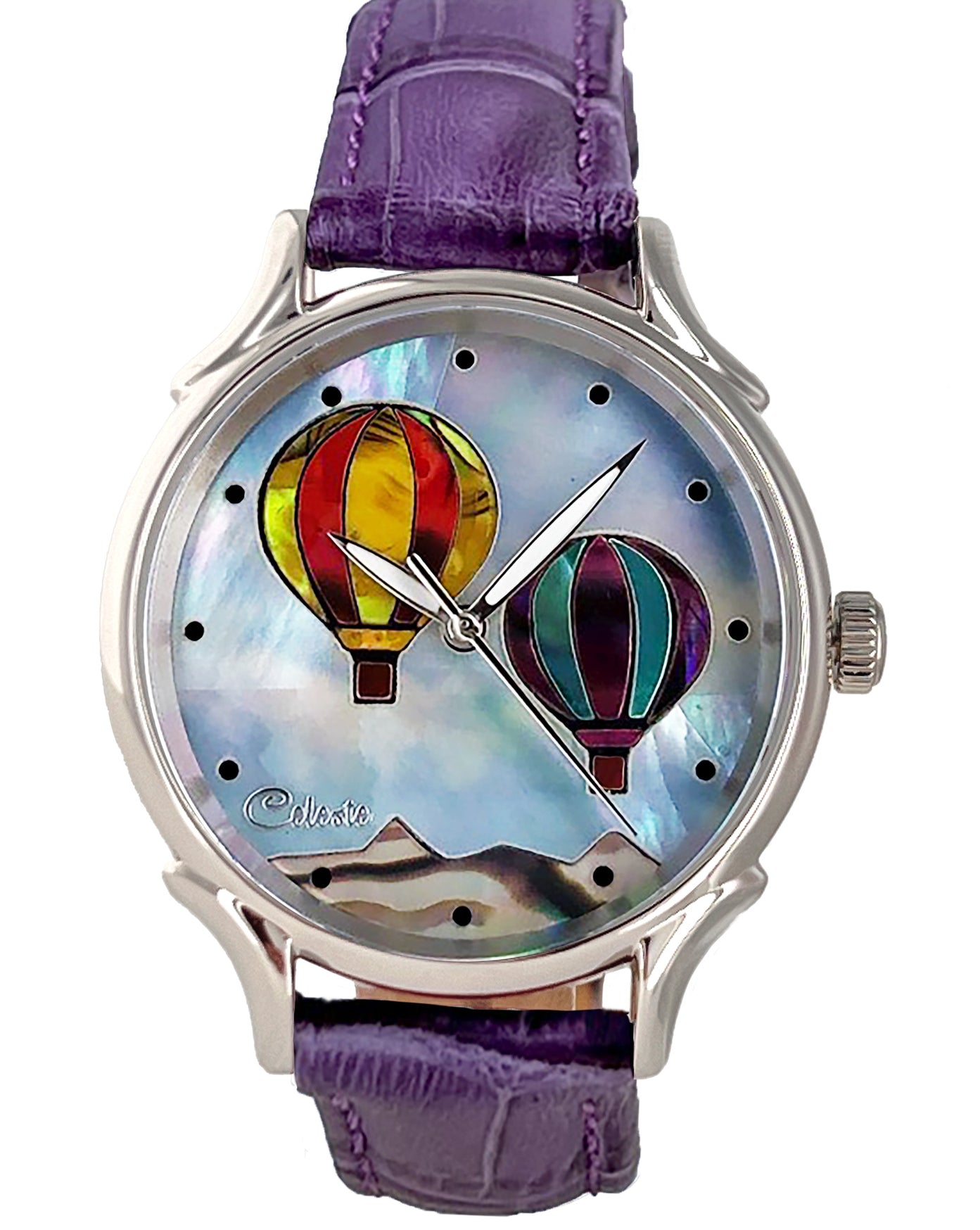 This collection explores color, height, and atmosphere through hand-inlaid shell and reflective depth. As light moves across the dial, the surface shifts like sky at different hours of the day.