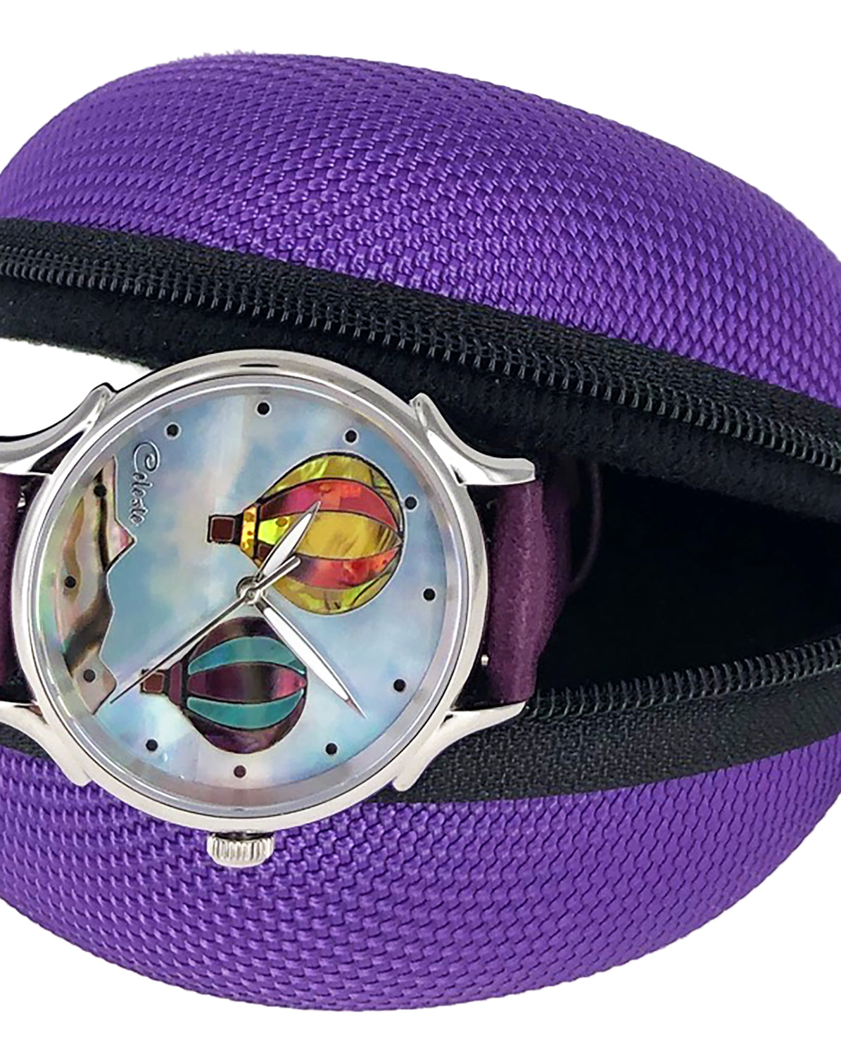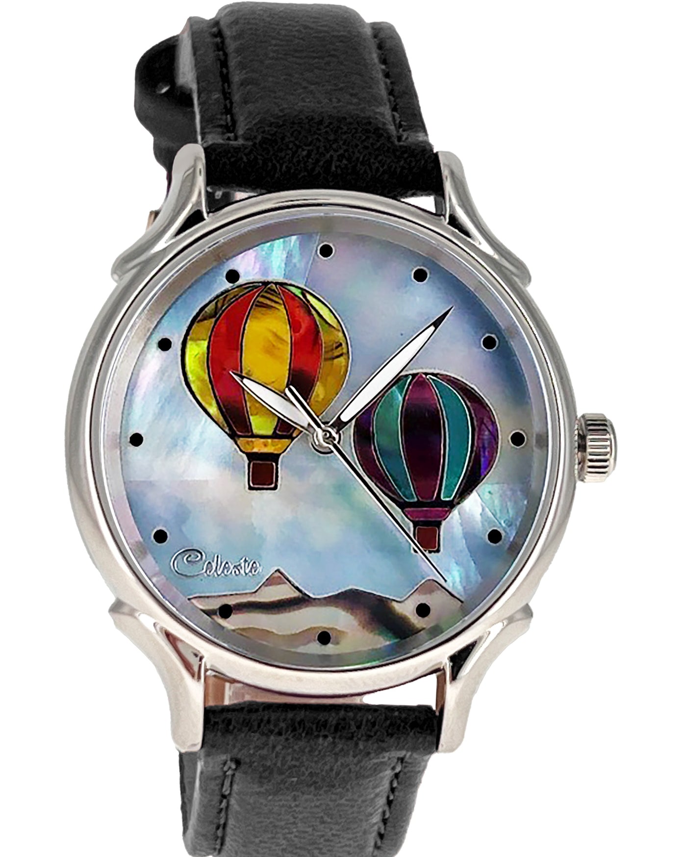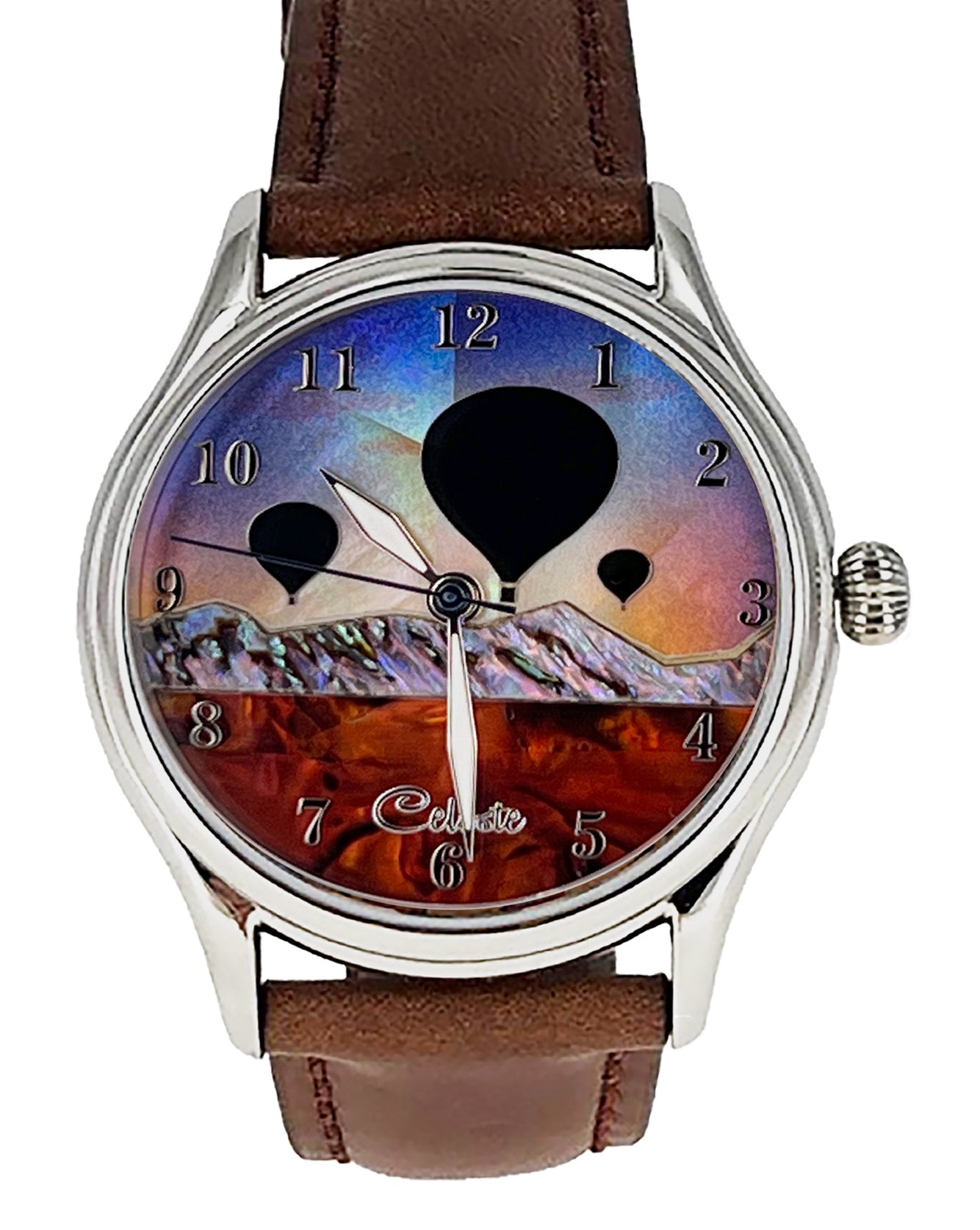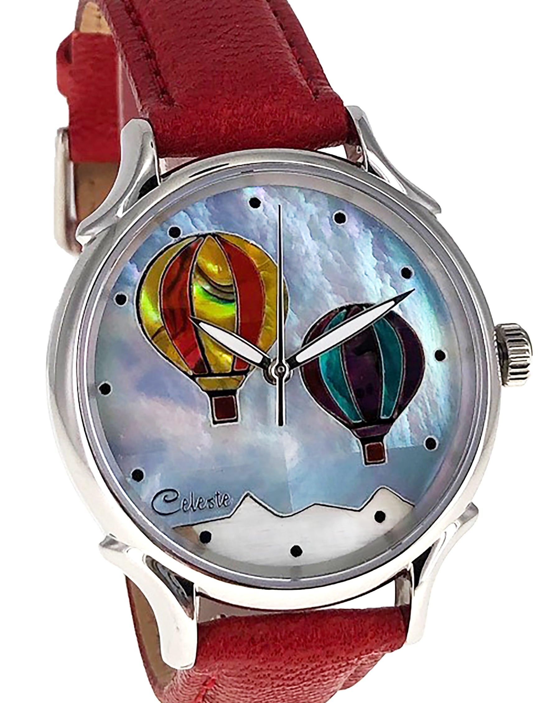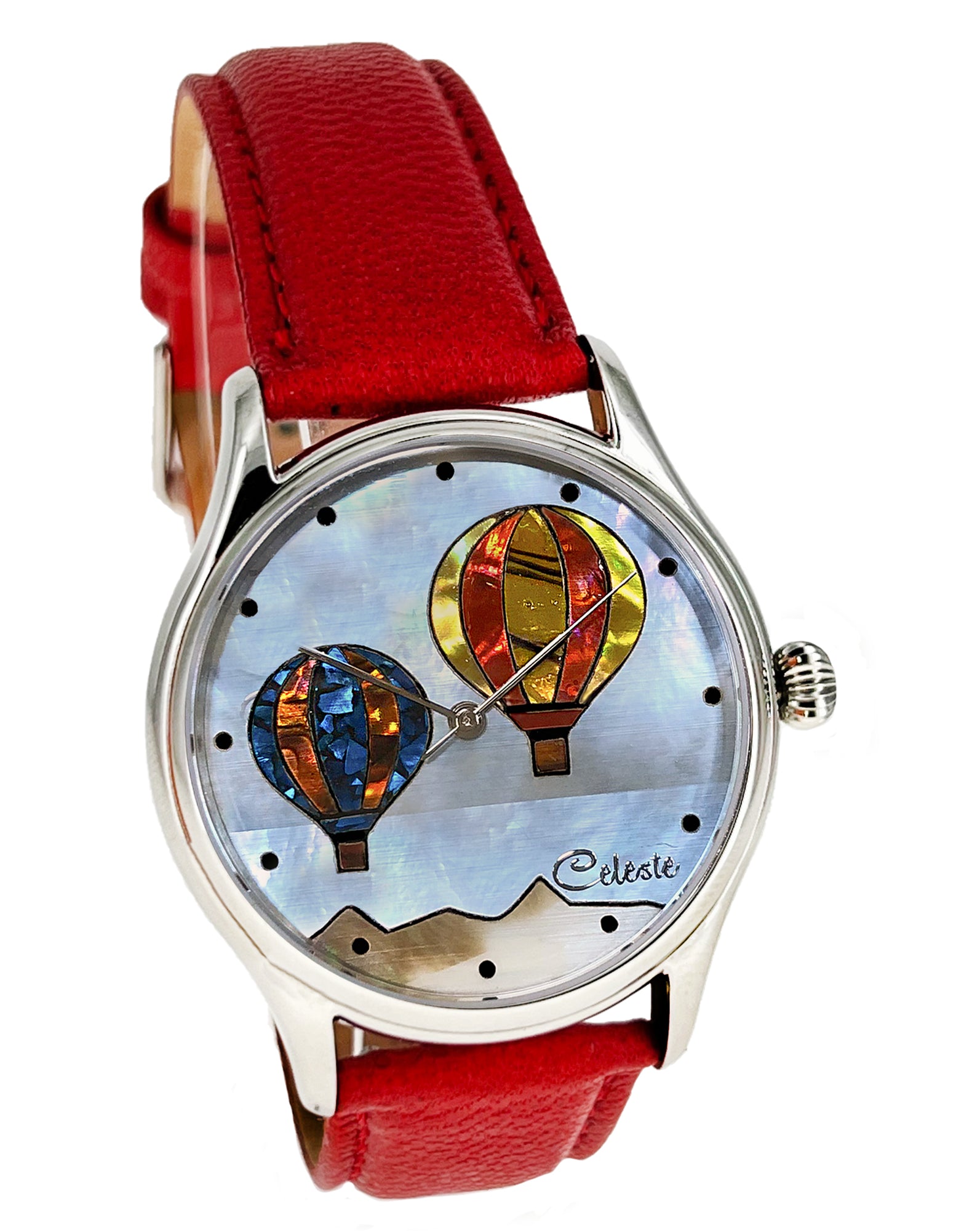 This collection explores color, height, and atmosphere through hand-inlaid shell and reflective depth. As light moves across the dial, the surface shifts like sky at different hours of the day.