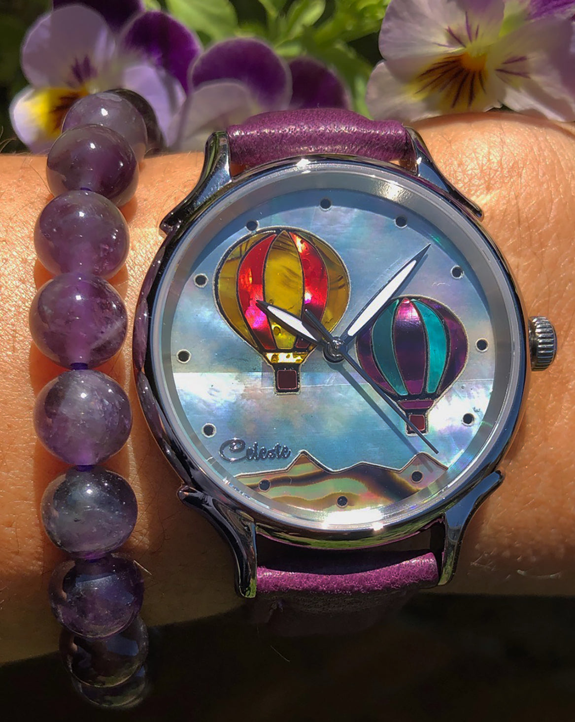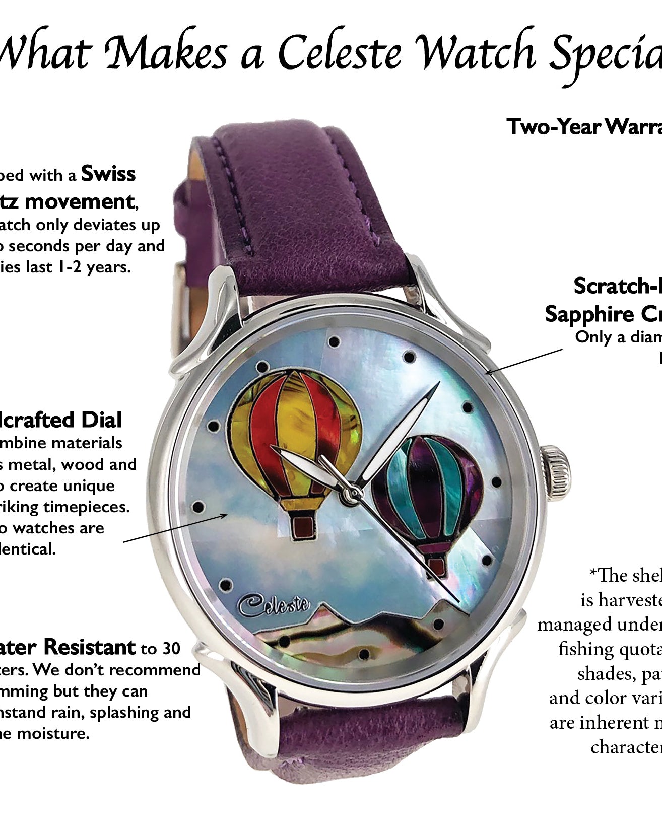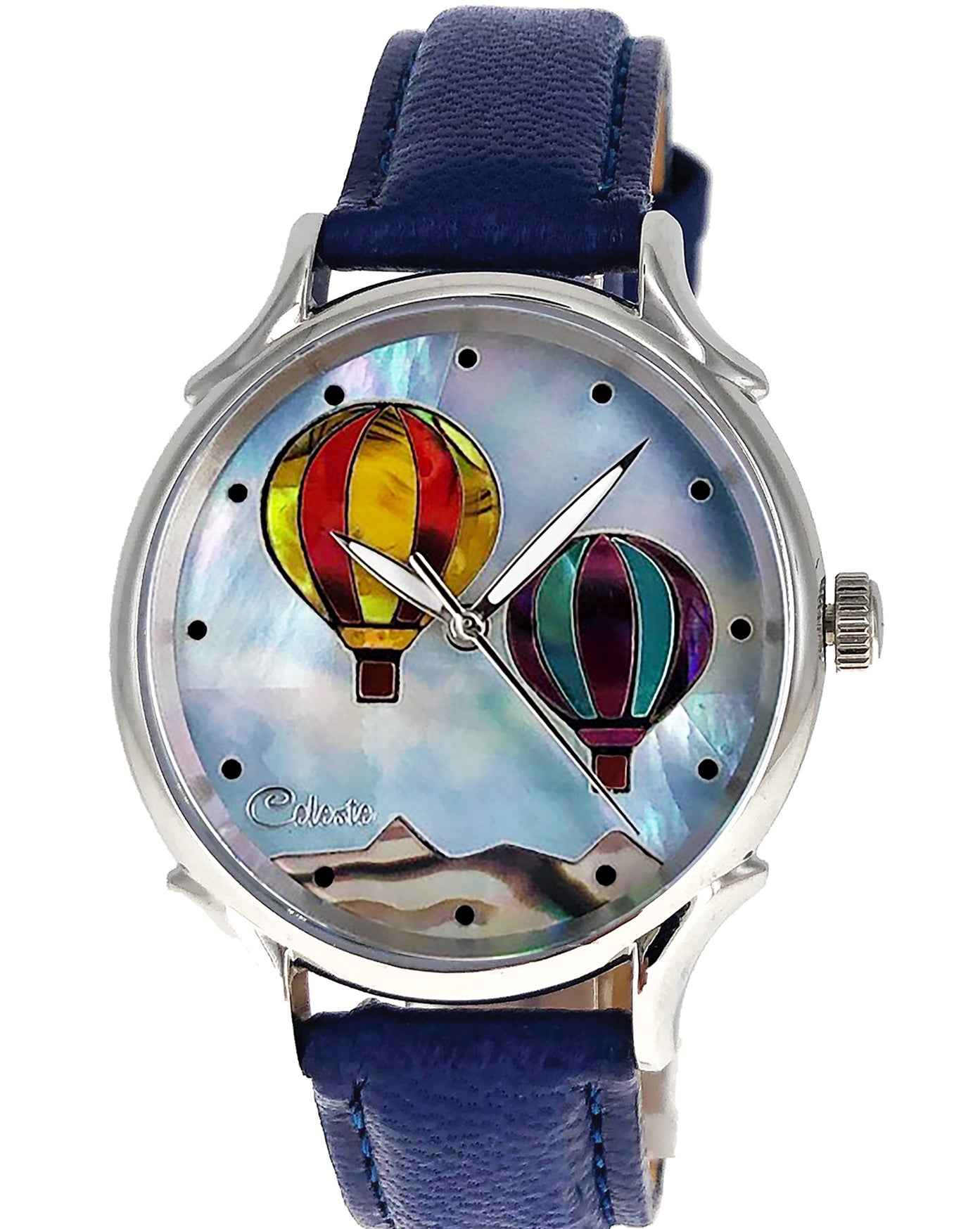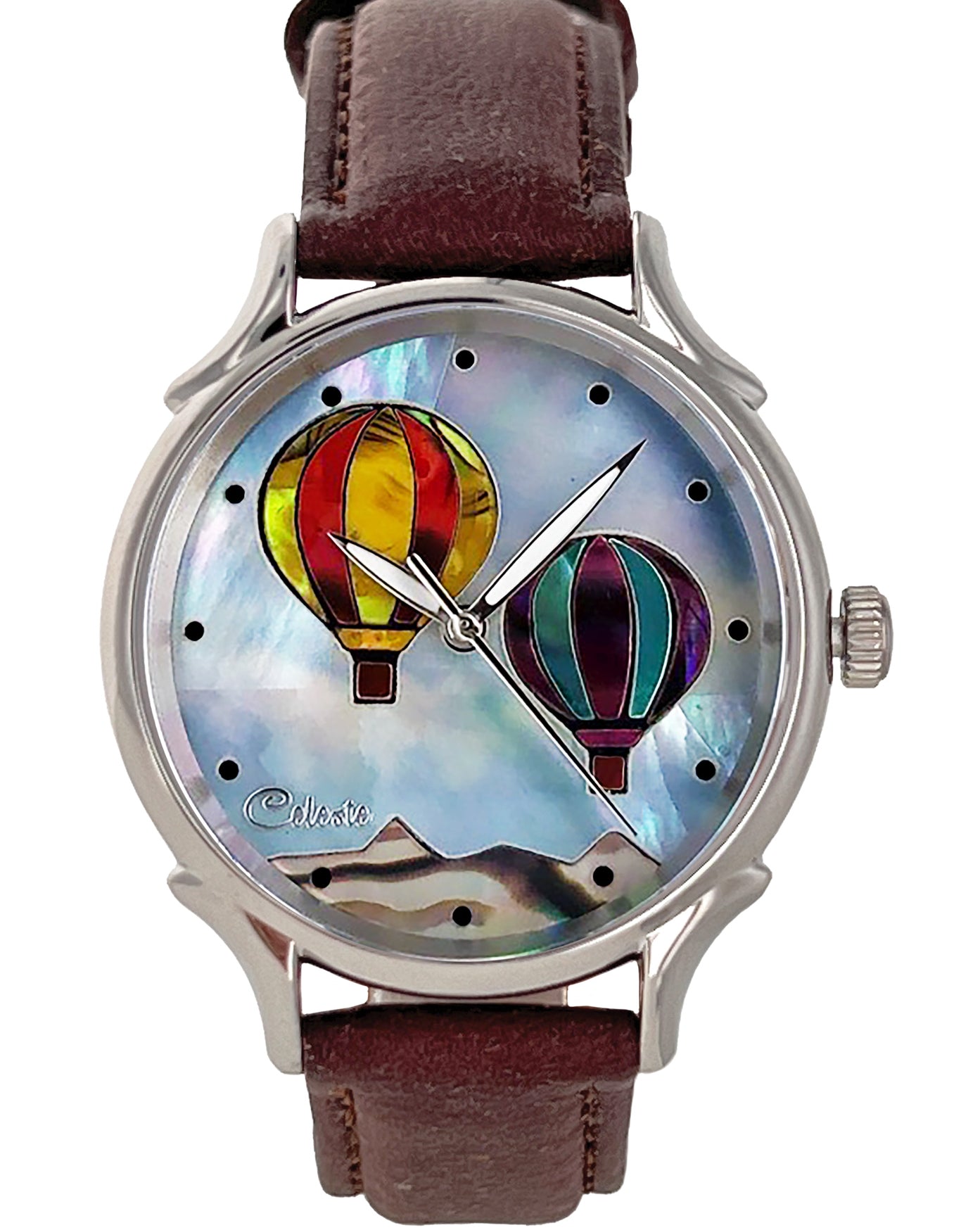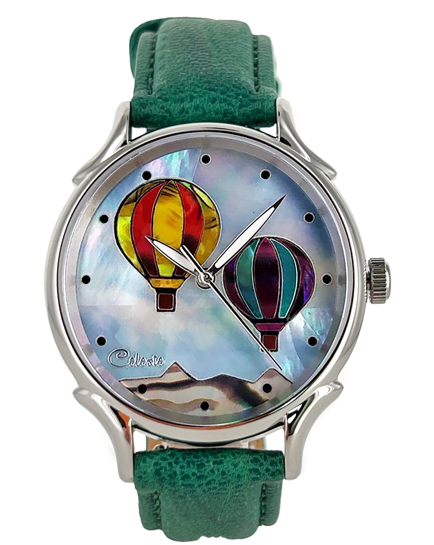 This collection explores color, height, and atmosphere through hand-inlaid shell and reflective depth. As light moves across the dial, the surface shifts like sky at different hours of the day.