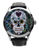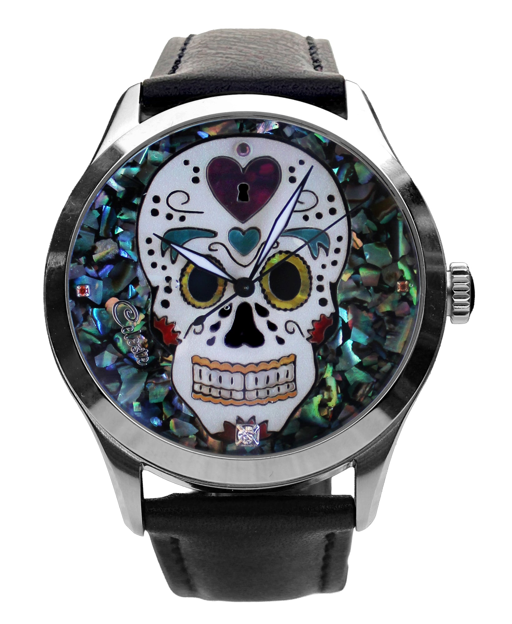 Our handcrafted sugar skull watch is a celebration of life and color. This Swiss automatic watch features the classic sugar skull design in a combination of mother of pearl and abalone shells set inside a 42mm 316L stainless steel case.