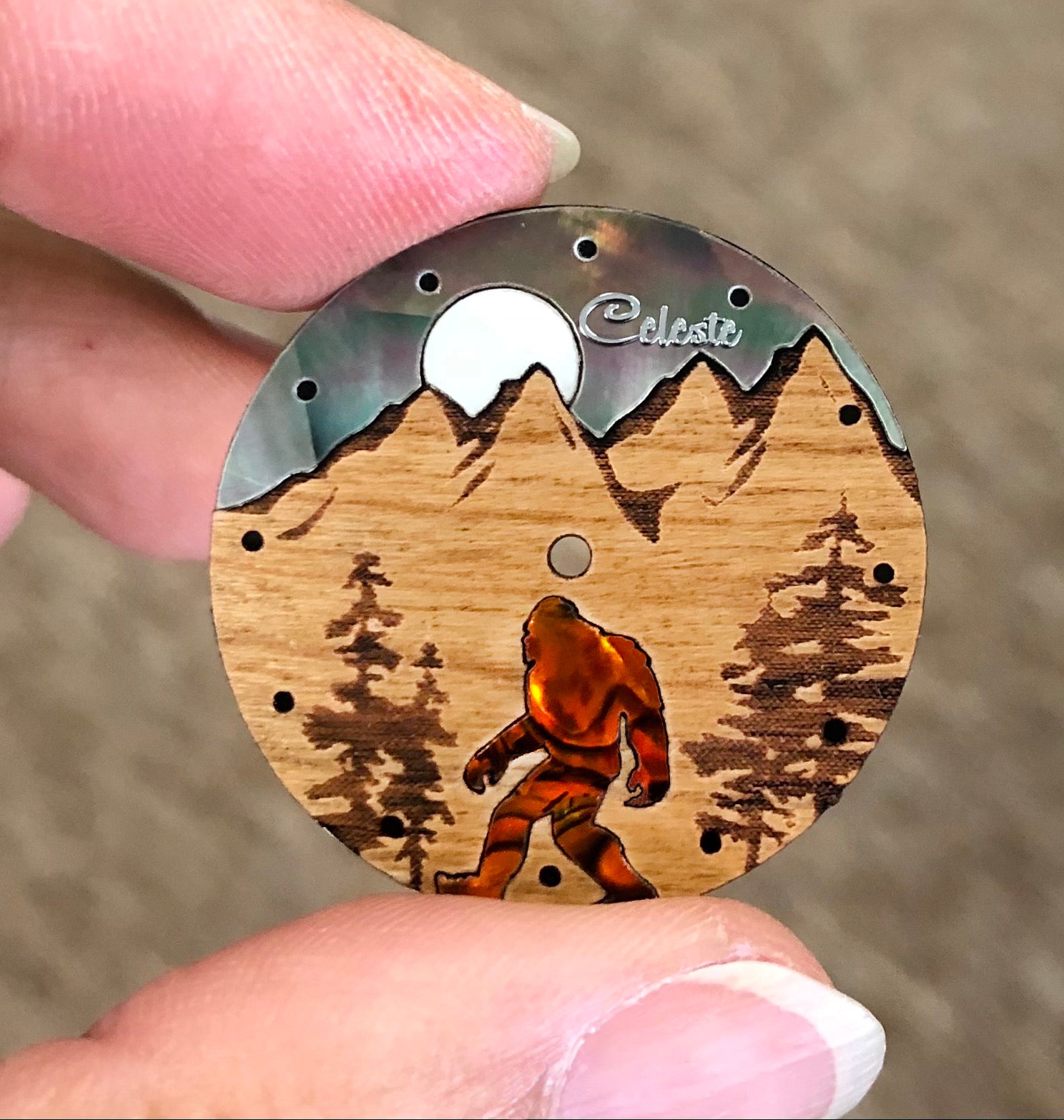 Each dial is crafted by hand in our studio in Springfield, Oregon. No two Bigfoots ever have the same mottled abalone patterns, the black lip abalone sky never has the same iridescence or reflection of light, and the engraved cherry wood has differing grains. Handmade, each watch is different from the others.