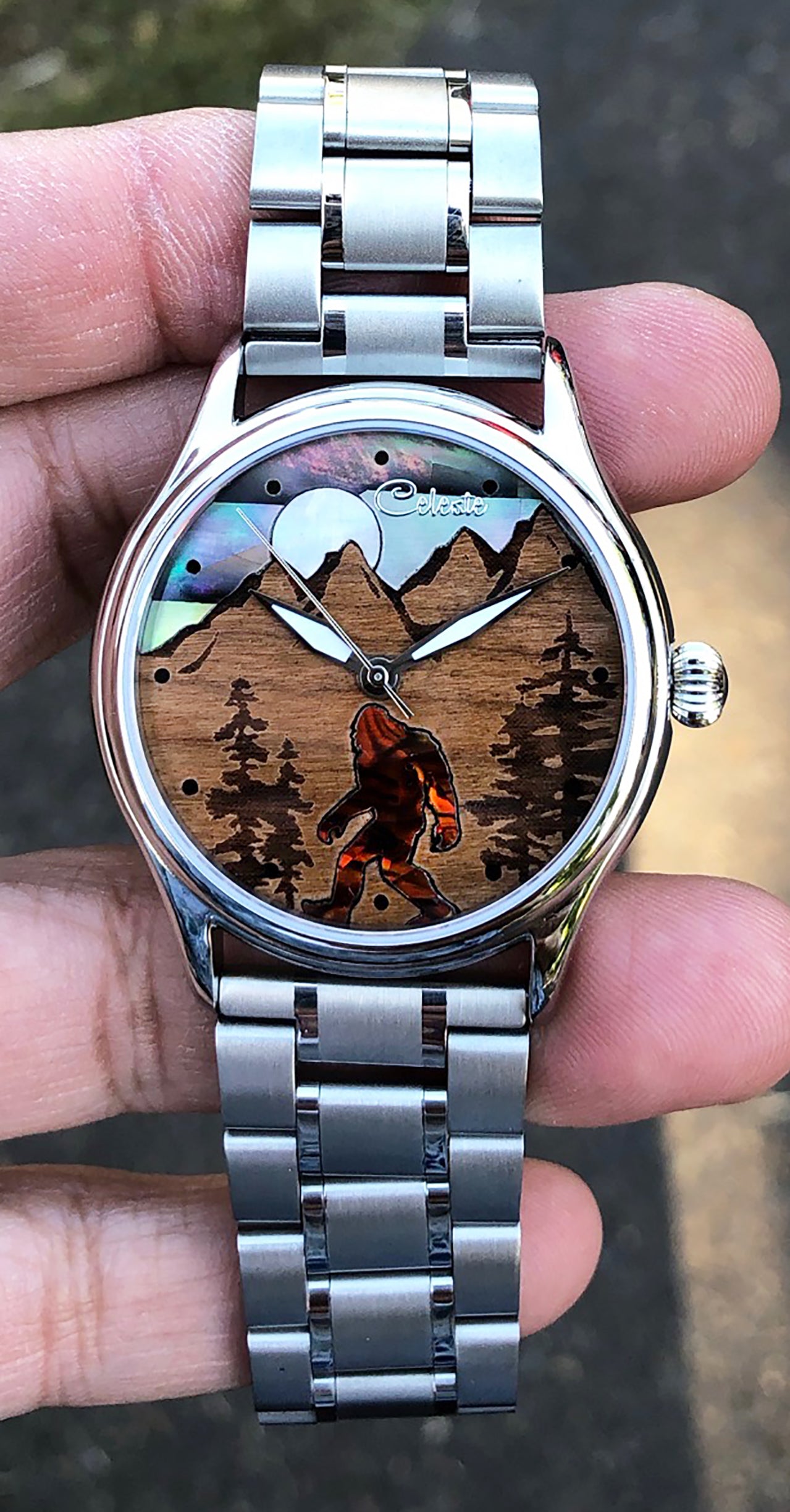 This amazing wrist art is an inlay, overlay, and marquetry at the same time. The dial features a cherry wood background engraved with trees and mountains, evoking the dense forests where legends are born. The sky is crafted from Tahitian black-lip abalone, the moon from luminous Mother of Pearl, and Bigfoot himself from abalone tinted a deep ochre brown. Butted up next to each other, we have Bigfoot roaming the forest under a full moon.