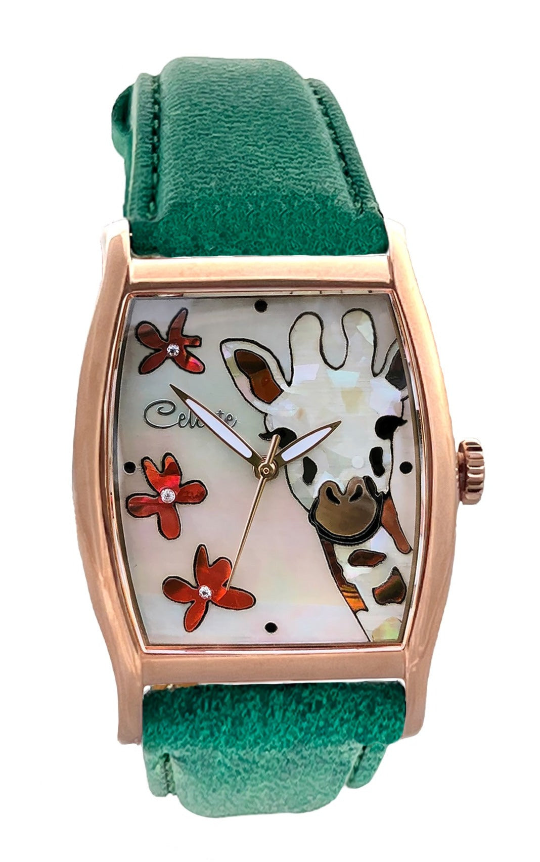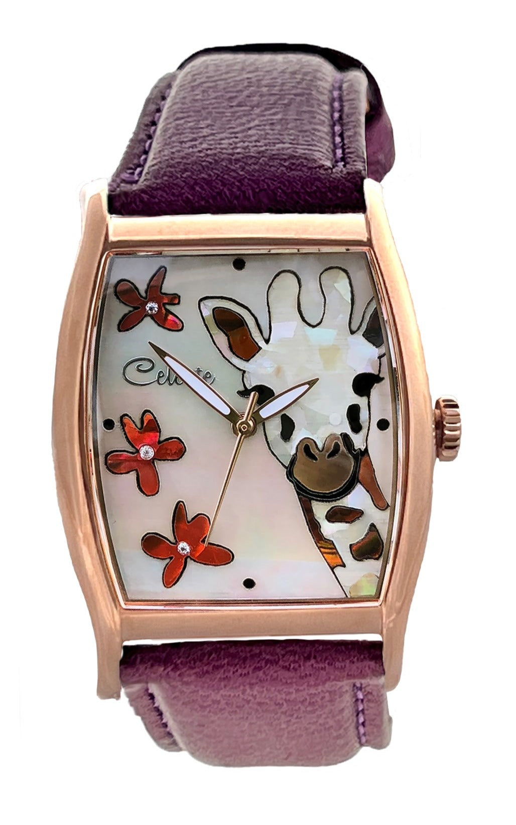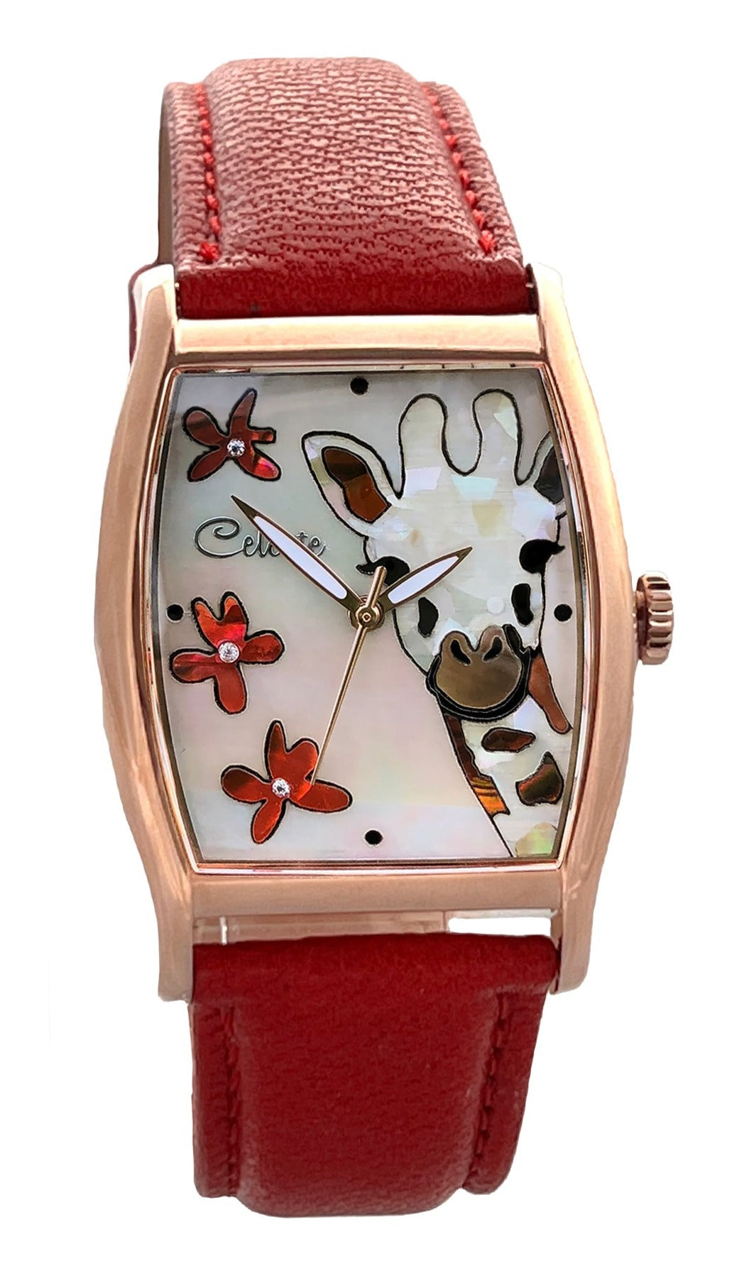 These sweet giraffe watches are works of art and perfect for everyone who loves to celebrate giraffes. Encased in a Rose Gold barrel shaped case, black time markers are included at the 12, 3, 6 and 9 to unobtrusively indicate the time.