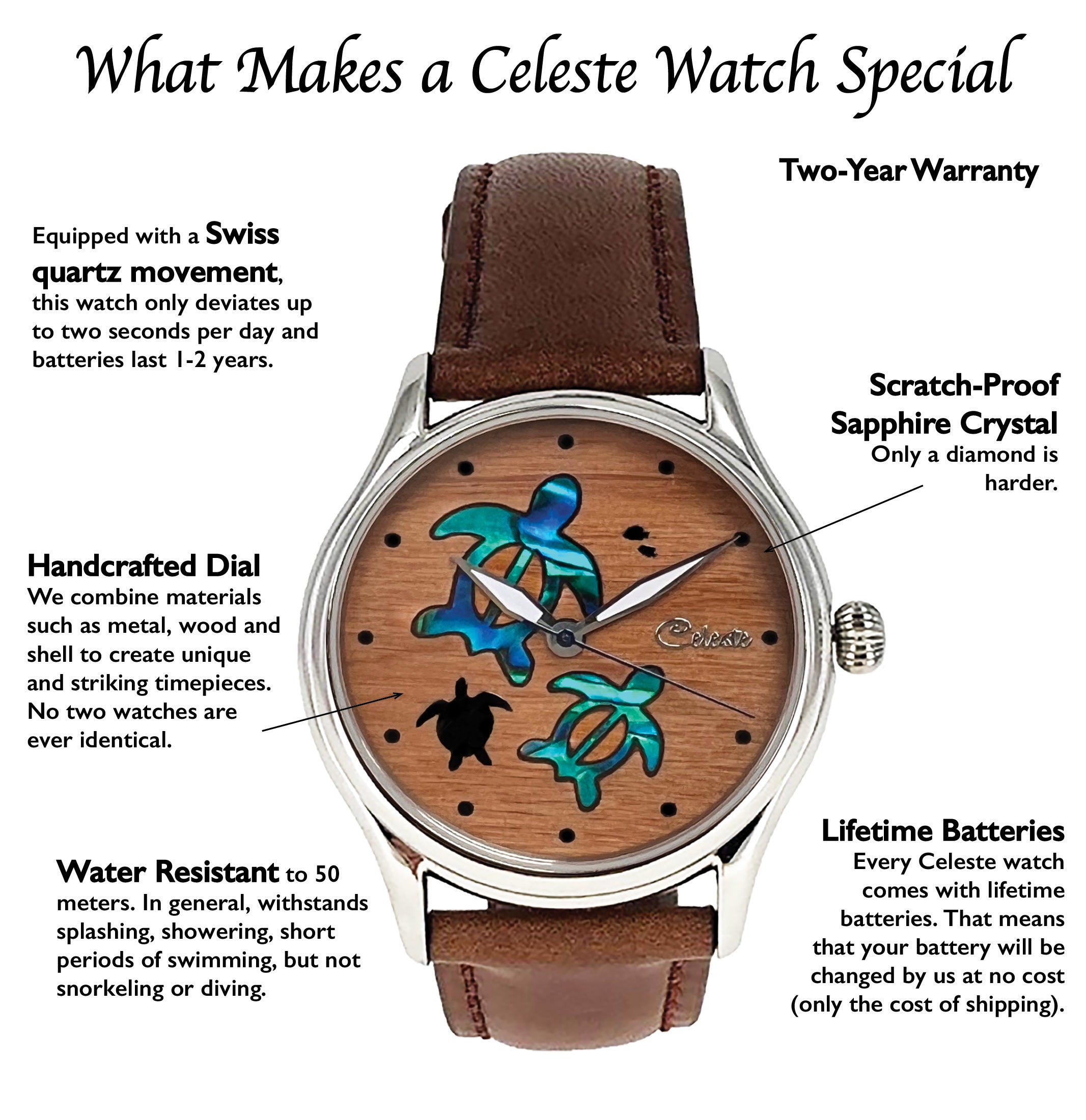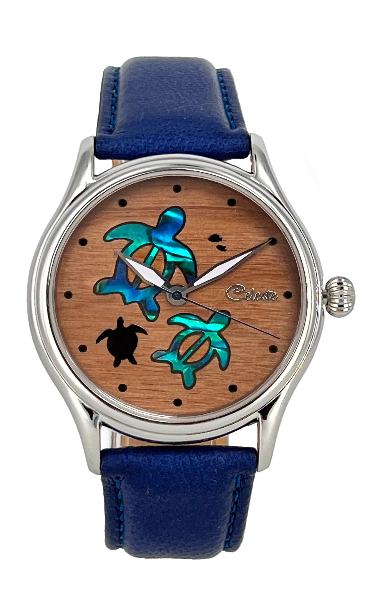 This dial features a warm alder wood background, chosen for its fine grain and natural golden tones. Inlaid within are sea turtles crafted from Paua abalone, their shells tinted in shades of ocean blue. The iridescent patterns shift and sparkle in the light, evoking the graceful movement of turtles gliding through tropical waters.