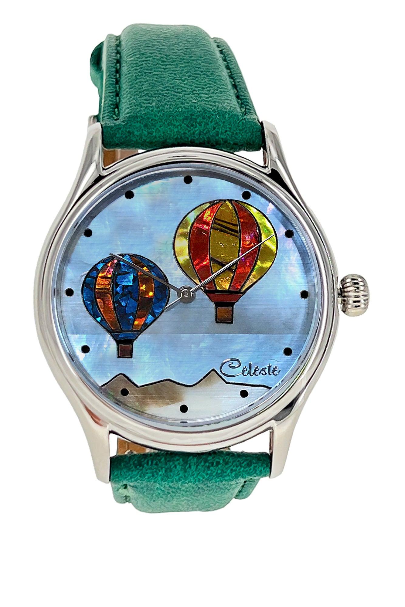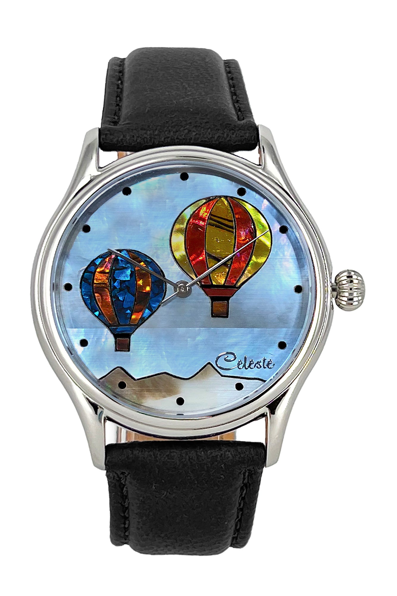 The colorful balloons hovering over the mountains are paua abalone inlaid in a blue Mother of Pearl tinted sky.