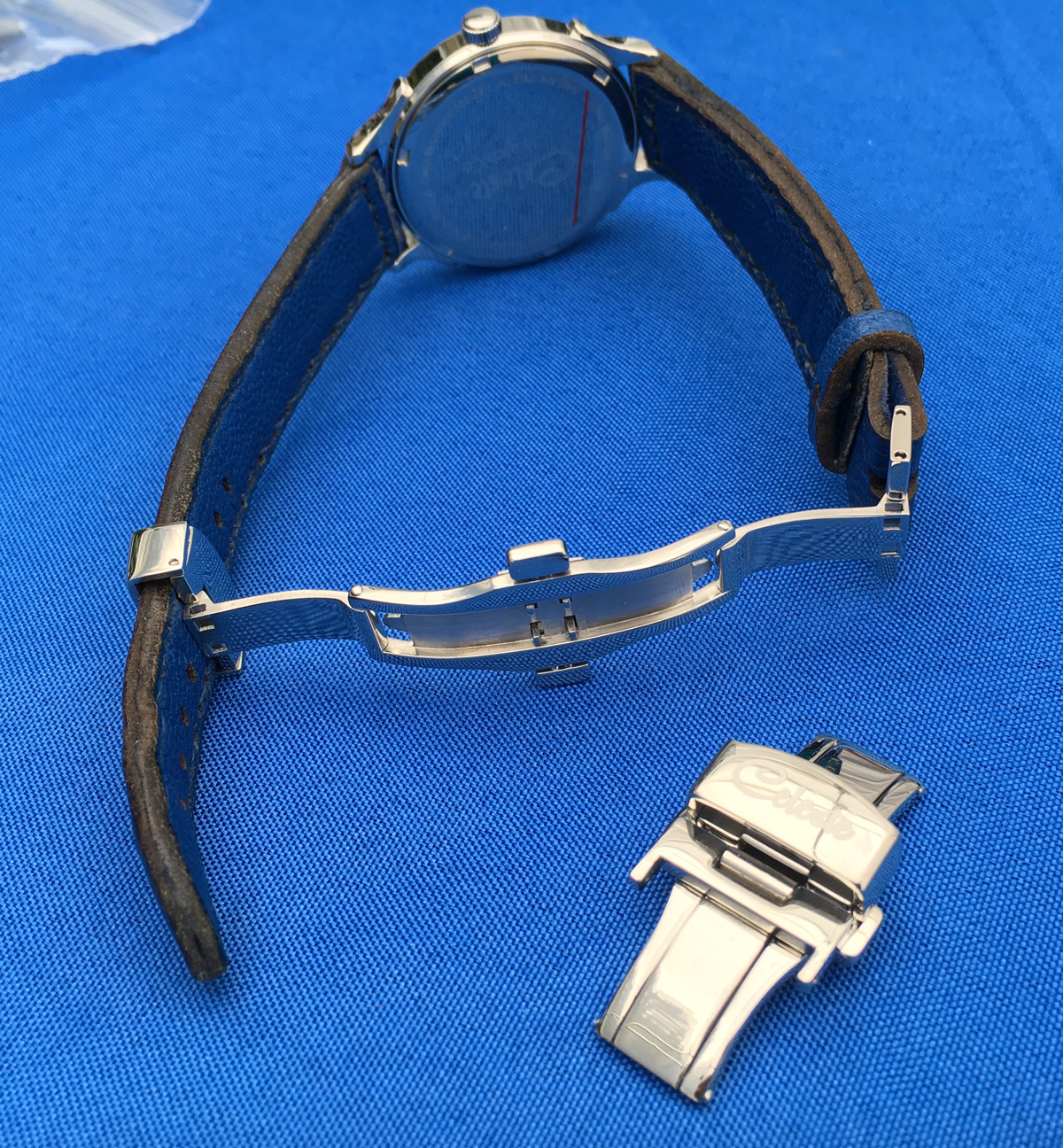 A Butterfly Buckle is a clasp on your band that makes your watch easier to take on and off. A butterfly buckle replaces a normal buckle on your watch band so it's always perfectly sized and easier to clasp. Set it once and it's done. It can also help your band last longer. The downside is that it’s a bit bulkier on the inside of your wrist.