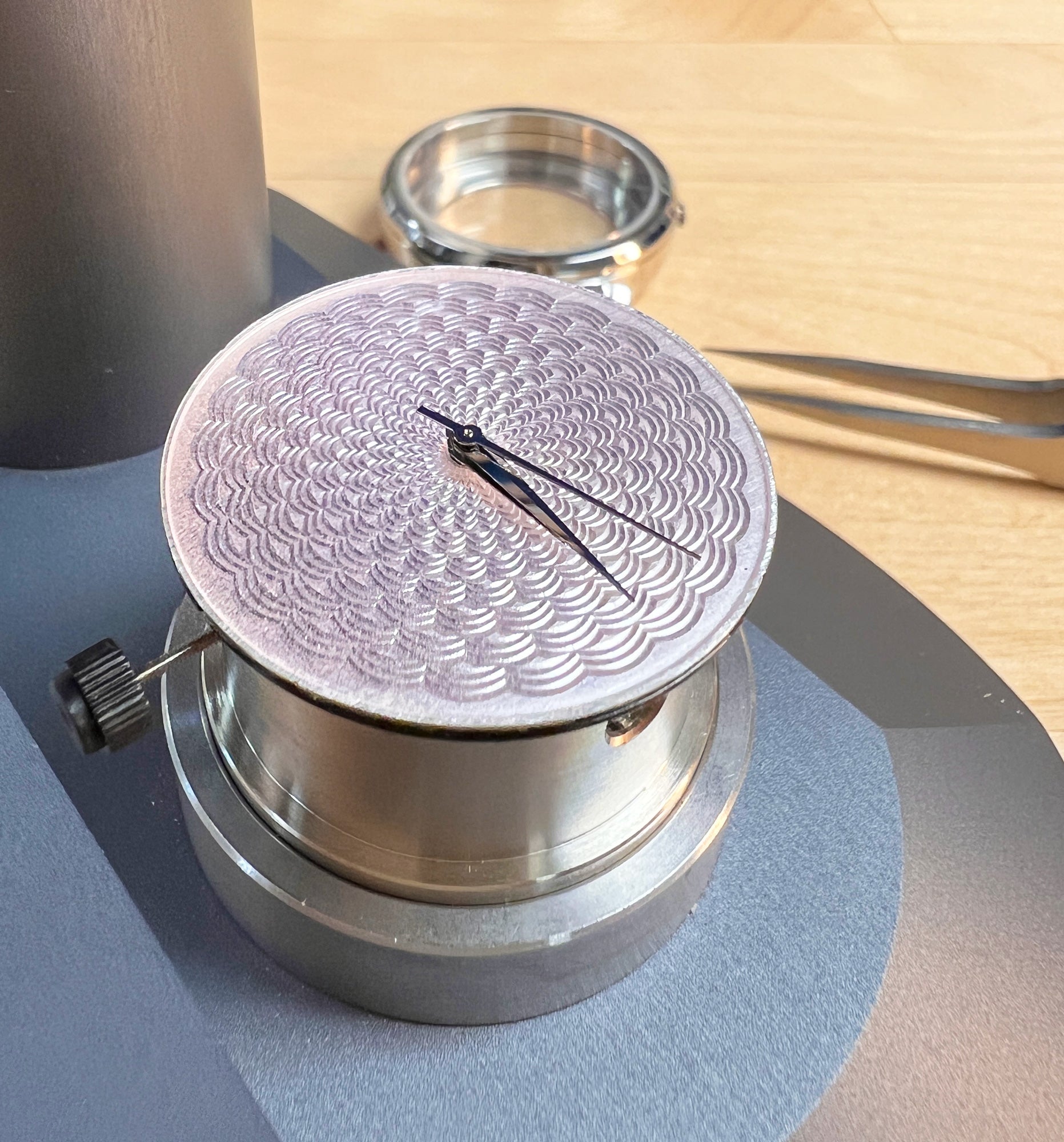 This rare hand-cut engine-turned (Guilloché) dial was a collaboration between guilloché artist Douglas Hall and enamel artist Rebecca Montgomery. Rebecca is not only an enamel artist but also the dial technician here at Celeste Watch Company.