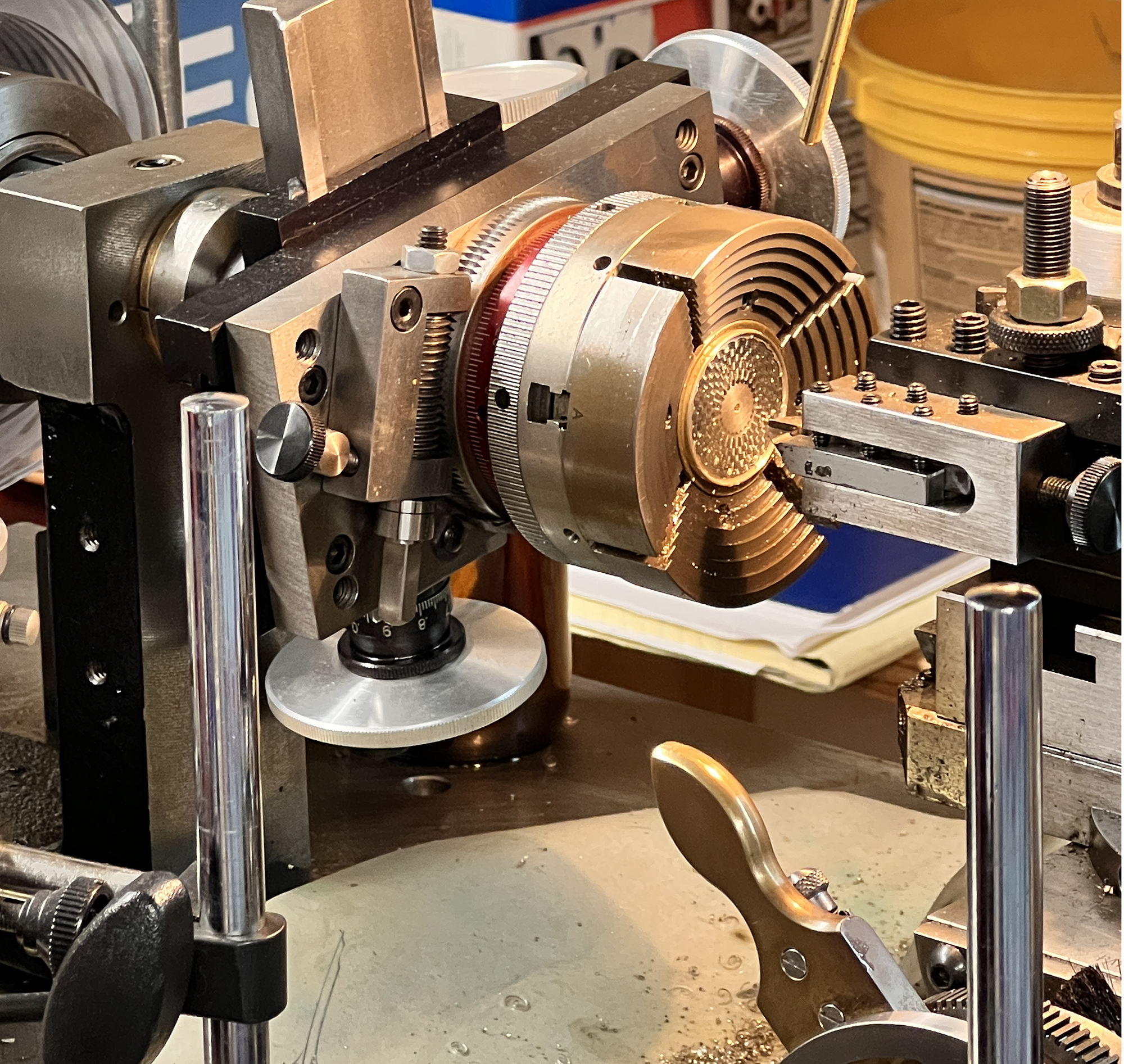 See the Chrysanthemum pattern being engraved with a Rose Engine machine onto a 99.9% fine silver dial.