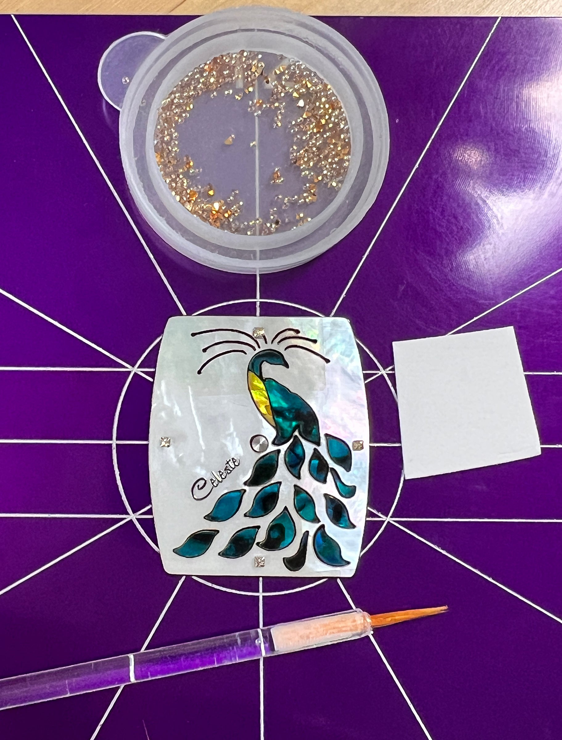 The purple-breasted style pairs the same ocean-blue–tinted abalone body with natural abalone tail feathers, each feather set into mother of pearl for a play of color that shifts with the light. Six petite Swarovski crystals, in a rainbow of hues, grace the crown atop the peacock’s head—like a jewel for a jewel.